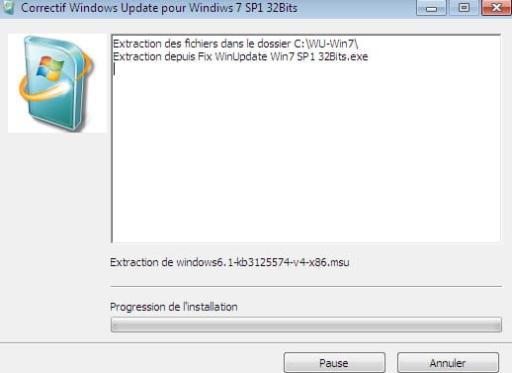 Double cliquez sur l’exécutable « Fix WinUpdate Win7 SP1 xxBits.exe » (xx = 32 ou 64Bits) pour lancer l’extraction des fichiers d’installation